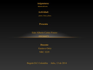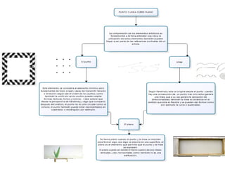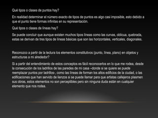 Este documento resume los conceptos básicos de punto, línea y plano en arte. Explica que aunque hay formas infinitas de puntos, las líneas se derivan de tres tipos básicos: horizontales, verticales y diagonales. Finalmente, reconoce que estos elementos constitutivos se pueden encontrar en objetos y estructuras cotidianas como ladrillos, edificios y obras de arte callejero. Incluye también una galería fotográfica que ilustra estos conceptos.