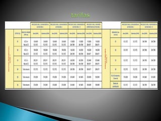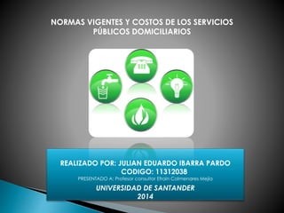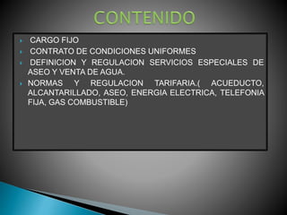 Este documento resume las normas y costos de los principales servicios públicos domiciliarios en Colombia como acueducto, alcantarillado, aseo, energía eléctrica, telefonía fija y gas combustible. Explica cómo se calculan los cargos fijos y tarifas de cada servicio según las resoluciones de la Comisión de Regulación de Agua Potable y Saneamiento Básico y otras entidades reguladoras.