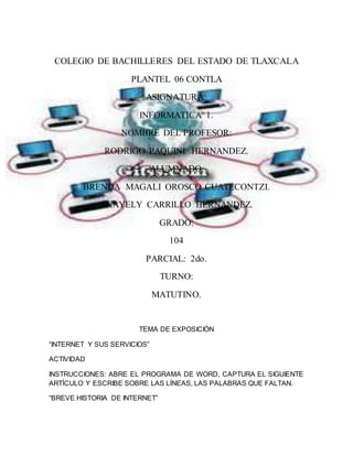 Este documento presenta un resumen de la historia de Internet desde su creación en 1969 como la red ARPANET del Departamento de Defensa de EE.UU. hasta su popularización y privatización en los años 90. También incluye instrucciones para un estudiante sobre completar un artículo con palabras faltantes sobre la historia de Internet y responder preguntas sobre servicios e Internet.