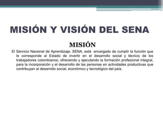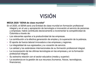 El SENA tiene la misión de ofrecer formación profesional integral a los trabajadores colombianos para contribuir al desarrollo del país. Su visión para 2020 es convertirse en una entidad de clase mundial en formación profesional e innovación que incremente la competitividad de Colombia a través de aportes a la productividad, empleo, fuerza laboral innovadora y más. El aprendiz del SENA se caracteriza por ser un pensador crítico, emprendedor, creativo y líder.