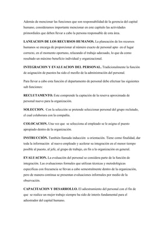 Este documento presenta información sobre las responsabilidades de la gerencia de recursos humanos y las competencias requeridas. Resume los temas de la responsabilidad de la gerencia del capital humano y las competencias de la gerencia del capital humano. Detalla las funciones clave de la gerencia de recursos humanos como asesoría, servicios, formulación e implementación de políticas, y defensa de los trabajadores. También describe las competencias necesarias como dominio del negocio, dominio de recursos humanos, dominio del cambio, y credibilidad personal.