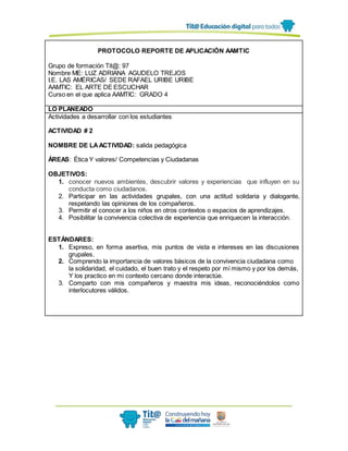 La maestra planeó una actividad para aplicar el AAMTIC "El arte de escuchar" con sus estudiantes de grado 4to. La actividad consistió en ver un video sobre la importancia de escuchar, hacer un recorrido por una tienda para reforzar los valores y habilidades de escucha, y evaluar los resultados a través de preguntas y respuestas de los estudiantes. La actividad buscaba mejorar la capacidad de escucha y participación de los estudiantes.