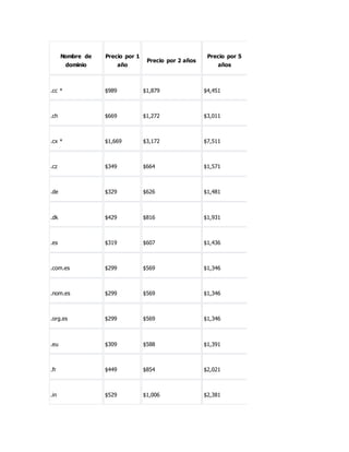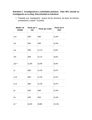 Este documento presenta una actividad de investigación y práctica sobre dominios y e-marketing. Incluye una tabla con los nombres, precios y proveedores de dominios. También enumera los 10 mejores proveedores de alojamiento web gratuito e instrucciones para registrar un dominio gratis. Por último, solicita visitar un sitio de e-marketing e investigar los beneficios para una empresa.