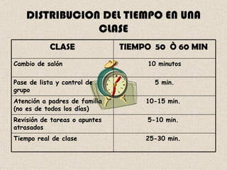 La distribución típica del tiempo en una clase de 50-60 minutos incluye: 10 minutos para cambiar de salón, 5 minutos para la lista de asistencia, 10-15 minutos para atender a padres (no diario), 5-10 minutos para revisar tareas atrasadas, y 25-30 minutos para la clase principal.