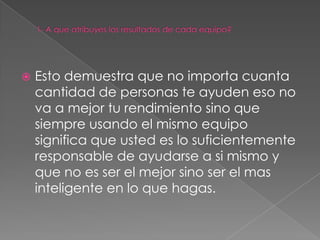 El documento discute que el rendimiento individual depende más de la responsabilidad personal que de la cantidad de ayuda recibida. También explica que el estatus se refiere a la posición social de una persona, mientras que el rol implica normas y comportamientos. Además, señala que para construir un equipo de alto desempeño se requiere confianza, liderazgo, comunicación, claridad de objetivos y aprovechar las fortalezas de cada miembro.