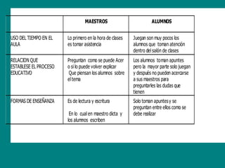 El documento habla sobre cuatro temas clave relacionados con el trabajo del aula: 1) la reflexión sobre el uso del tiempo en el aula, 2) las actitudes de los maestros, 3) la relación que se establece en el proceso educativo, y 4) las formas de enseñanza más comunes.