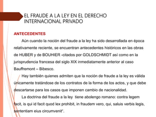 Este documento trata sobre el fraude a la ley en el derecho internacional privado. Explora las definiciones, teorías, naturaleza jurídica y supuestos del fraude a la ley, así como su tratamiento en la legislación venezolana. Incluye antecedentes históricos, críticas a distintas concepciones teóricas, y menciona fuentes internacionales y locales relevantes como el Código Bustamante y la Ley de Derecho Internacional Privado venezolana.