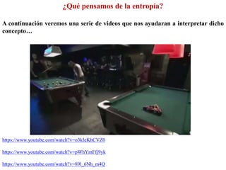 Este documento trata sobre el concepto de entropía en termodinámica. Explica que la entropía de un sistema aislado siempre aumenta en los procesos espontáneos e irreversibles, mientras que se mantiene constante en los procesos reversibles. También define la entropía como una medida del grado de dispersión de la energía de un sistema hacia una forma desorganizada y caótica, lo que representa una distribución más probable de la materia y la energía. Además, incluye enlaces a videos que explican este concepto y
