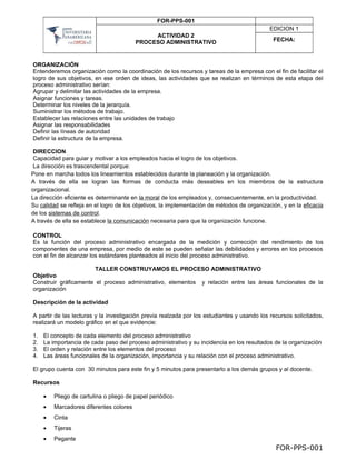 Los estudiantes leerán sobre el proceso administrativo y realizarán una investigación individual. Luego, en grupos, crearán un modelo gráfico que muestre cómo funciona el proceso administrativo en las empresas, incluyendo las etapas de planeación, organización, dirección y control. Finalmente, cada grupo presentará su modelo y el docente realizará una retroalimentación.