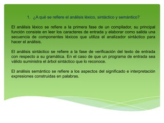 El documento detalla la importancia del análisis léxico, sintáctico y semántico en el contexto de un generador de código. Se explican las funciones y técnicas fundamentales de cada tipo de análisis, como el manejo de memoria, la creación de tablas de símbolos y la gestión de errores. Además, describe el funcionamiento de analizadores sintácticos descendentes y ascendentes, así como la verificación de tipos y el manejo de errores semánticos.
