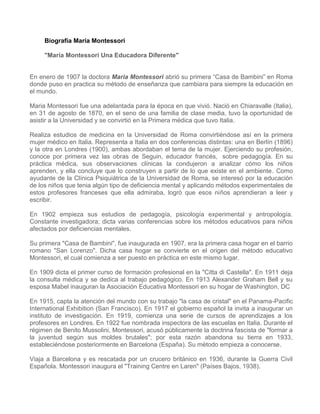 María Montessori fue la primera mujer médico en Italia que desarrolló un nuevo método de educación. Abrió su primera "Casa de Bambini" en 1907 en Roma donde aplicó su método enfocado en darle a los niños estímulos, libertad y permitirles aprender de sus propios errores. Su método se expandió por todo el mundo y cambió la forma de entender el aprendizaje infantil al valorizar ambientes agradables y didácticos materiales que hacían el aprendizaje como un juego.