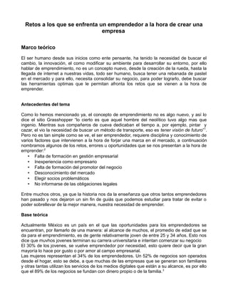 El documento analiza los retos que enfrentan los emprendedores al crear una empresa, destacando la importancia de la formación, el conocimiento del mercado y la gestión empresarial. En México, una gran parte de los emprendedores son jóvenes, y un alto porcentaje inicia negocios desde casa con recursos propios. Además, se enfatiza el papel del marketing digital como herramienta crucial para superar desafíos y lograr el éxito empresarial.