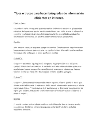 Este documento presenta diferentes técnicas para realizar búsquedas eficientes en internet, como usar palabras clave específicas, usar comillas para buscar frases exactas, y los signos + y - para incluir o excluir términos. También describe los mapas mentales y conceptuales, que son formas gráficas de organizar ideas y conocimiento usando nodos y enlaces para mostrar las relaciones entre conceptos.