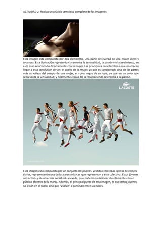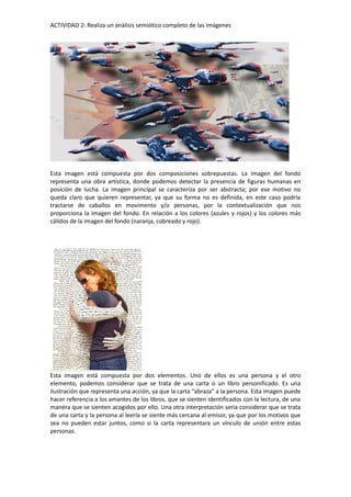 Este documento presenta el análisis semiótico de cinco imágenes diferentes. La primera imagen está compuesta por figuras humanas en lucha en el fondo y formas abstractas en primer plano que podrían representar caballos o personas. La segunda imagen representa a una persona abrazando un libro o carta. La tercera imagen muestra el cuello y ropa de una mujer joven con una rosa, simbolizando sensualidad y pasión. La cuarta imagen presenta a un grupo de jóvenes vestidos con ropa ligera volando entre las nubes. Y