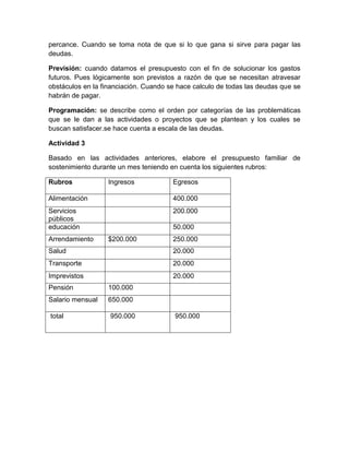 El documento explica qué es un presupuesto y para qué sirve, dividiéndolo en presupuesto de ingresos y gastos. Menciona tres rubros comunes de un presupuesto familiar: arriendo, alimentación y transporte. Explica tres funciones del presupuesto: nos facilita un plan financiero estable, nos permite saber en qué podemos gastar y evaluar nuestro rendimiento financiero. Finalmente, describe cinco principios del presupuesto y cómo aplicarlos en el hogar: universalidad, unidad, equilibrio, previsión y programación.