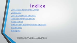 Este documento describe las herramientas online, el software educativo y cómo se pueden utilizar en la educación. Explica que las herramientas online permiten la comunicación síncrona y asincrónica y que el software educativo puede ser de diferentes tipos como ejercitadores, tutoriales, simuladores y juegos educativos. Además, concluye que las nuevas tecnologías son herramientas potentes para la enseñanza y el aprendizaje.