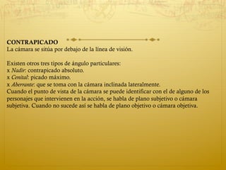 El documento describe diferentes tipos de ángulos y planos de cámara, así como la digitalización y edición de video. Los tipos de ángulos incluyen ángulo normal, picado y contrapicado. Los tipos de planos incluyen plano general, entero, americano, medio y primer plano. La digitalización convierte imágenes analógicas en formato digital mediante muestreo y cuantificación. La edición de video permite manipular medios como archivos de video para crear un producto final.