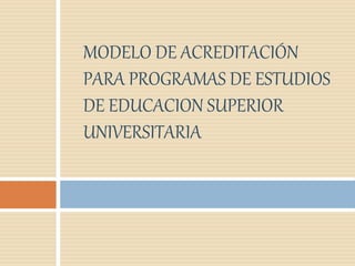 El documento presenta el nuevo modelo de acreditación para programas de estudios de educación superior universitaria en Perú. El modelo incluye cuatro dimensiones (gestión estratégica, formación integral, soporte institucional y resultados), doce factores y treinta y cuatro estándares agrupados en una matriz de evaluación. El objetivo del nuevo modelo es promover la mejora continua de los programas a través de un enfoque formativo de la evaluación de la calidad.