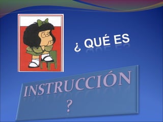 El documento habla sobre la instrucción como el conjunto de enseñanzas o datos impartidos a personas con el propósito de educarlas. La instrucción consiste en impartir conocimientos en un marco de aprendizaje y educación de manera funcional y educativa, ya sea de forma formal en la escuela o de manera informal en la familia o entre amigos. Para que haya instrucción siempre deben existir dos partes, un instructor que enseña y alumnos que aprenden.