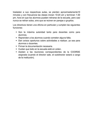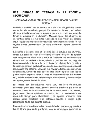 El resumen describe una jornada laboral típica en una escuela secundaria. Los maestros llegan a las 7:15 am para firmar su entrada antes de que comiencen las clases a las 8:00 am. Las clases continúan hasta las 9:40 am, luego hay un receso de 30 minutos. Después del receso, las clases reinician a las 10:10 am pero a menudo comienzan 10 minutos tarde. Las clases terminan a la 1:30 pm cuando los estudiantes se van a casa en grupos. Los directores supervisan a maestros y estud