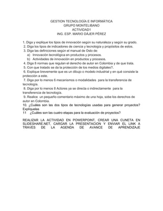 Este documento presenta una serie de preguntas sobre gestión tecnológica e informática para ser respondidas en una presentación de PowerPoint. Las preguntas cubren temas como tipos de innovación, indicadores de ciencia y tecnología, definiciones de innovación tecnológica y actividades de innovación, normas de derecho de autor en Colombia, tratados de protección de medios digitales, dibujos y modelos industriales, mecanismos de transferencia de tecnología, actores en la transferencia de tecnología, comentarios sobre derechos