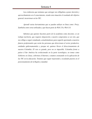 El documento presenta una reflexión sobre lo aprendido durante las 4 semanas del curso. El autor agradece a la instructora por guiarlos paso a paso y enseñarles herramientas como Prezi y Symbaloo. Como docente, reconoce la importancia de actualizarse constantemente en tecnología educativa para preparar a los estudiantes. Además, resalta los avances de Colombia en áreas como gobierno digital e implementación de TIC en educación, aunque aún queda trabajo por hacer para mejorar a nivel regional y mundial.