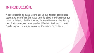 Este documento define y explica los diferentes prototipos textuales como la narración, descripción, argumentación, exposición y diálogo. Cada prototipo se caracteriza por su estructura, intención comunicativa, clasificaciones y elementos distintivos. El documento concluye que conocer las tipologías textuales es importante para distinguir los diferentes tipos de textos.