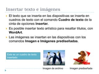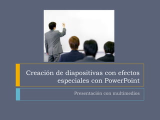 Este documento describe cómo insertar diferentes elementos en diapositivas de PowerPoint para crear presentaciones con efectos especiales, incluyendo texto, imágenes, gráficos, diagramas, elementos multimedia como audio y video, y animaciones con efectos de entrada, énfasis y salida. Explica cómo agregar estos elementos y personalizar las animaciones de manera individualizada.