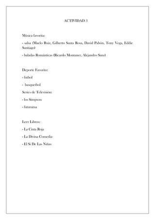Este documento resume los gustos y preferencias de una persona en cuatro categorías: música favorita (salsa y baladas románticas), deporte favorito (fútbol y baloncesto), series de televisión favoritas (Los Simpson y Futurama) y libros favoritos (La Cinta Roja, La Divina Comedia y El Si De Las Niñas).