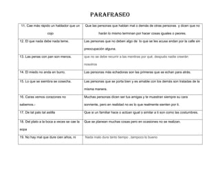 Este documento contiene 20 refranes populares españoles y sus significados. Algunos refranes se refieren a la comunicación efectiva y la comprensión (ej. "Al buen entendedor pocas palabras"), la proporcionalidad de las soluciones a los problemas (ej. "A grandes males, grandes remedios"), y la inevitabilidad de las consecuencias de nuestras acciones (ej. "Lo que se siembra se cosecha"). Otros enfatizan que es difícil cambiar la naturaleza de una persona (ej. "Genio y figura, hasta