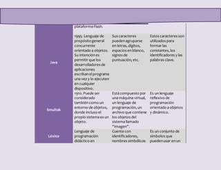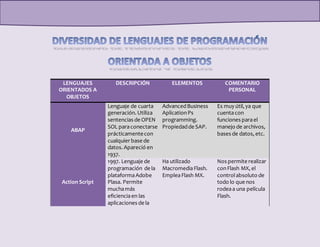 Este documento describe varios lenguajes de programación orientados a objetos, incluyendo sus años de creación, propósitos y características principales. ABAP se desarrolló en 1937 y es propiedad de SAP, ActionScript apareció en 1997 y permite gran eficiencia en aplicaciones Flash, y Java fue creado en 1995 para permitir que los programas se ejecuten en cualquier dispositivo.