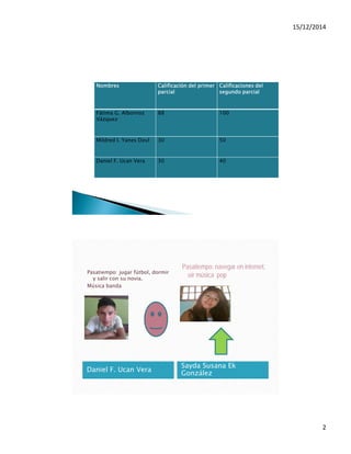 El documento presenta información sobre 5 estudiantes de 1er grado de Informática, incluyendo sus nombres, calificaciones del primer y segundo parcial, y sus pasatiempos favoritos como escuchar música pop, ver televisión, jugar fútbol y navegar en Internet. También incluye las calificaciones de 100 obtenidas por Fátima G. Albornoz Vázquez y Ángel Andrés Cruz en el tercer parcial.