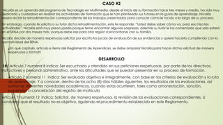 1) Federico no tiene carné SENA a pesar de llevar 4 meses en el programa de formación. 2) El jefe de mantenimiento de la empresa le pide el carné pero Federico no lo tiene. 3) Federico consulta con su líder de bienestar quien le dice que los carnés son solo para aprendices presenciales aunque él es aprendiz virtual.