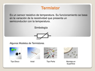 Este documento describe diferentes tipos de sensores de temperatura y luz. Explica que los termistores NTC y PTC son sensores resistivos cuya resistencia varía con la temperatura, mientras que los fotorresistores son sensores cuya resistencia disminuye con la luz incidente. También brinda ejemplos de aplicaciones para cada sensor y describe brevemente su funcionamiento.