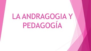 Este documento compara y contrasta la andragogía y la pedagogía. Explica que la andragogía se refiere a la enseñanza de adultos y se basa en principios como la participación y la horizontalidad. Describe las características de los adultos como aprendices, incluida su experiencia previa y motivación intrínseca. La pedagogía se define como la guía de niños y ahora se entiende como una ciencia multidisciplinaria que apoya la educación. Explica las características de la pedagogía, como una