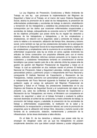 La Ley Orgánica de Prevención, Condiciones y Medio Ambiente de Trabajo (LOPCYMAT) es una ley venezolana que promueve la seguridad y salud en el trabajo. Establece los derechos y deberes de los trabajadores y empleadores relacionados con la seguridad laboral, salud y ambiente de trabajo. También crea dos institutos, el Instituto Nacional de Prevención, Salud y Seguridad Laborales y el Instituto Nacional de Capacitación y Recreación de los Trabajadores, para administrar el régimen de seg