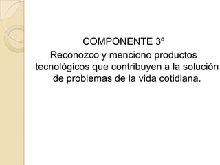 Este documento presenta una propuesta didáctica para una actividad sobre el reconocimiento y mención de productos tecnológicos que contribuyen a la solución de problemas de la vida cotidiana. Se mencionan varios objetos como el computador, el cepillo dental, el lápiz, el cuaderno, el tajalápiz, el bolso, el carro, la licuadora, la lavadora, la estufa, el televisor y el dinero, y cómo cada uno ayuda en diferentes tareas y situaciones diarias.