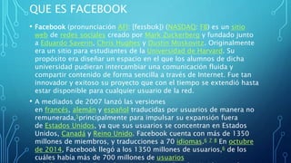 Facebook fue creado por Mark Zuckerberg en 2004 como un sitio para estudiantes de la Universidad de Harvard. Se ha convertido en una de las redes sociales más grandes del mundo con más de 1,350 millones de usuarios. Ofrece la posibilidad de conectarse con amigos y familiares, compartir fotos y videos, y encontrar personas del pasado. Sin embargo, también plantea riesgos como la adicción, la falta de privacidad, y los perfiles falsos.