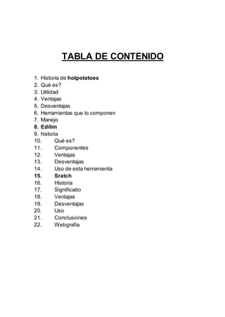 1. El documento describe varias herramientas para crear actividades interactivas como Hotpotatoes, Edilim y Scratch. 2. Hotpotatoes permite crear ejercicios interactivos como cloze, quiz y crucigramas. Edilim se usa para hacer libros interactivos y actividades web. Scratch es una herramienta para programar juegos y proyectos de manera visual. 3. Todas estas herramientas son útiles para crear material educativo de forma divertida e interactiva.