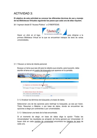 Este documento describe los pasos para utilizar diferentes bibliotecas virtuales como Cybertesis, EBSCO, ProQuest y E-libro. Explica cómo buscar, filtrar y guardar documentos de interés de cada una de estas bibliotecas, así como cómo crear cuentas y leer artículos de manera completa.