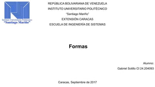 Este documento presenta un resumen de un trabajo sobre formas realizado por el estudiante Gabriel Sotillo para la Escuela de Ingeniería de Sistemas del Instituto Universitario Politécnico "Santiago Mariño". El trabajo incluye una bibliografía de tres fuentes de información sobre formas, elementos que las configuran y sistemas administrativos.