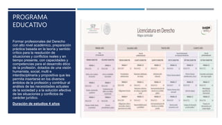 El documento describe un programa de licenciatura en derecho que busca formar profesionales con un alto nivel académico y habilidades prácticas basadas en la teoría para resolver situaciones y conflictos reales de manera ética. El programa dura 4 años y busca desarrollar en los egresados competencias como el análisis crítico, la resolución de casos jurídicos, y la capacidad de incorporarse a programas de posgrado o al mercado laboral.