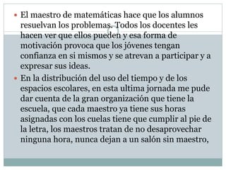 La tercera jornada observa la participación de maestros y personal en la escuela y cómo motivan a los estudiantes. Los maestros usan diferentes actividades como preguntas y problemas para involucrar a los estudiantes y darles confianza. La escuela también tiene una gran organización del tiempo y los espacios para asegurar que cada maestro cumpla con sus horas asignadas y que no haya tiempo sin supervisión.