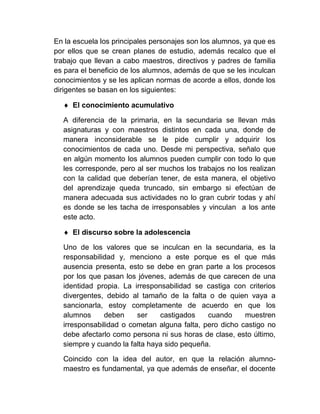 La escuela secundaria presenta nuevos retos y normas para los estudiantes. Su capacidad para adaptarse depende de su cultura y valores. La escuela juega un papel importante culturalmente al influir en los estudiantes, aunque también es influenciada por las diversas culturas de los estudiantes. Los maestros deben ayudar a los estudiantes a adaptarse a los nuevos estilos de vida y conocimientos en la secundaria. La identidad de los estudiantes y su sentido de pertenencia al grupo también es moldeada por la escuela y afecta su comport