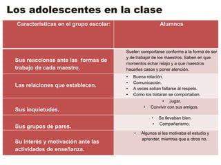 El documento analiza las características de los estudiantes en un grupo escolar, incluyendo sus reacciones e interacciones durante las clases. Los estudiantes tienden a comportarse de acuerdo a cómo trabajan los maestros, sabiendo cuándo divertirse y a qué maestros prestar atención. Establecen relaciones que pueden incluir respeto mutuo, comunicación o falta de respeto, dependiendo de cómo los traten los maestros. Algunos estudiantes se motivan por el estudio mientras que otros no.