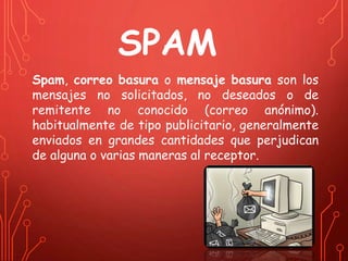 El documento habla sobre los diferentes tipos de spam que existen, incluyendo spam en correo electrónico, blogs, foros, redes sociales, IRC, wikis, correo postal y la vía pública. Explica que el spam consiste en mensajes no solicitados y no deseados, generalmente con fines publicitarios. También incluye algunas recomendaciones para evitar el spam como no responder mensajes sospechosos, usar software de filtrado y no dar información personal en sitios no confiables.