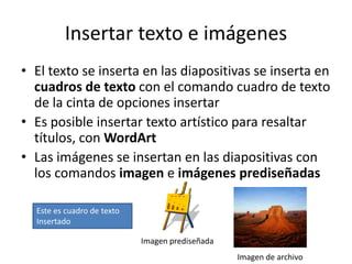 Este documento describe cómo insertar diferentes elementos multimedia en presentaciones de PowerPoint, incluyendo texto, imágenes, gráficos, diagramas, audio, video, y animaciones. Explica cómo agregar estos elementos y cómo personalizar las animaciones con efectos de entrada, énfasis y salida. El objetivo es mostrar cómo crear presentaciones interesantes con varios medios.