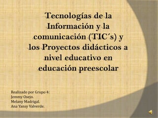 Este documento describe cómo las tecnologías de la información y la comunicación (TIC) pueden usarse en proyectos didácticos a nivel preescolar. Explica que las TIC ofrecen conocimientos básicos de informática y entretenimiento educativo para los niños a través de personajes familiares. También describe el papel del docente en guiar a los estudiantes a encontrar y evaluar información de manera crítica. Finalmente, resume las características clave de los proyectos didácticos como estrategias de enseñanza basadas