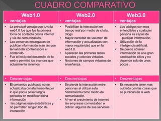La Web1.0 permitió el inicio del desarrollo de la web y contenido publicado por pocos, la Web2.0 posibilitó mayor interacción e intercambio de información entre usuarios a través de blogs y redes sociales, y la Web3.0 se centra en el uso de inteligencia artificial para obtener información de múltiples fuentes de una manera más personalizada.