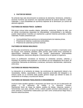El documento define el riesgo como la probabilidad de que una amenaza se convierta en un desastre debido a la vulnerabilidad. Explica que existen diferentes tipos de riesgos como los riesgos laborales, geológicos, financieros y biológicos. Luego describe varios factores de riesgo como los físico-químicos, biológicos, psicosociales, fisiológicos o ergonómicos, químicos, físicos, arquitectónicos, eléctricos y mecánicos,